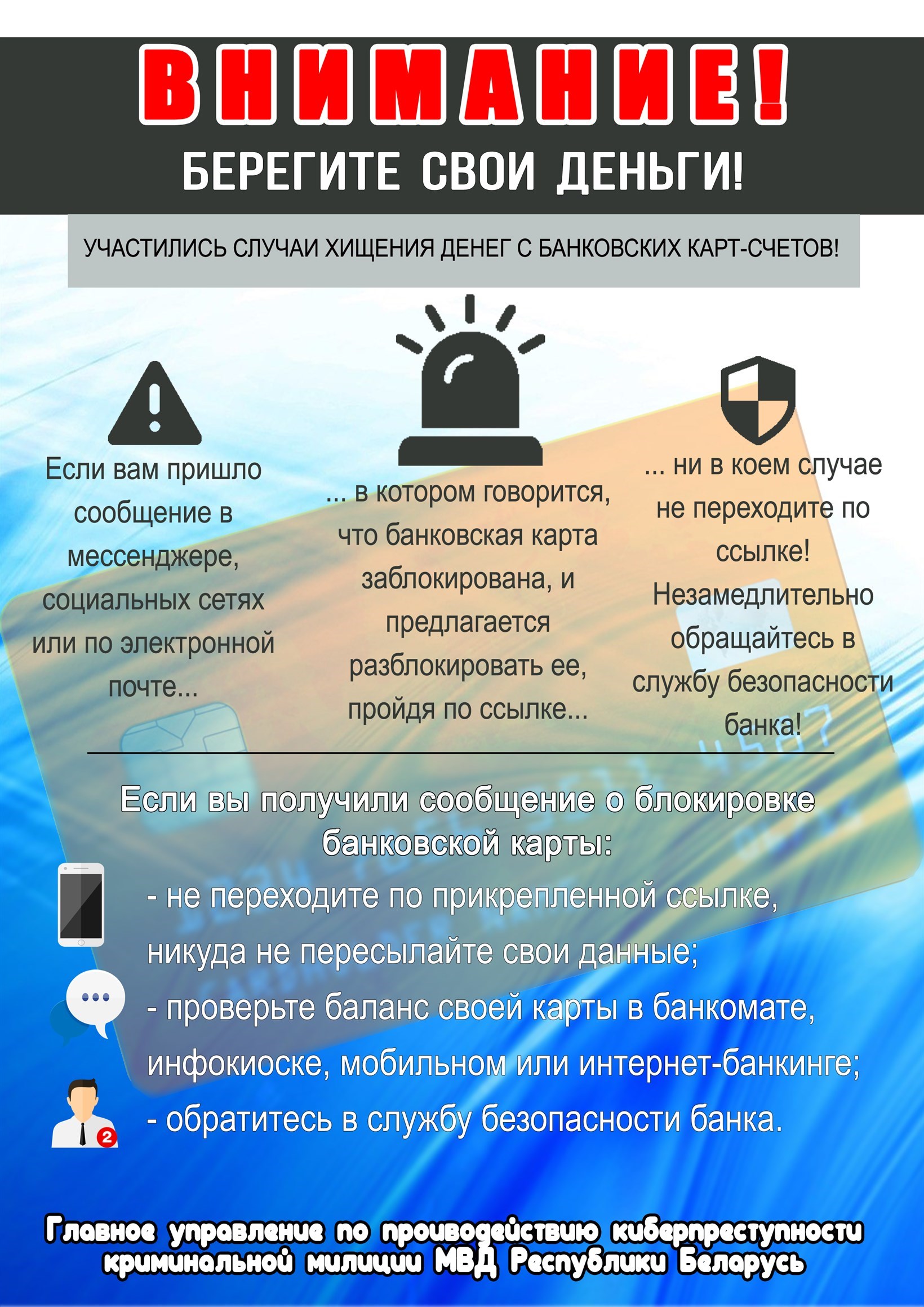 не доверяйте звонящим, представляющимся сотрудниками правоохранительных органов, специалистами банковских учреждений и операторов мобильной связи, работниками почты, обратившимся к ВАМ с просьбами (требованиями) об оказании содействия в изобличении преступников, предоставлении паспортных и иных личных данных, реквизитов банковских карт, а также о декларировании денежных средств.